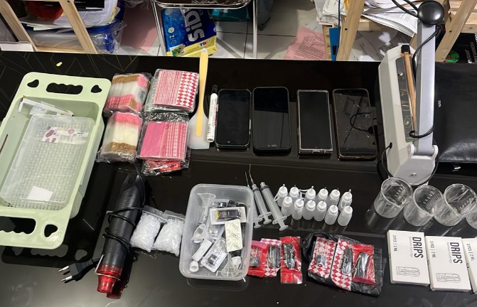 Dalam pengungkapan ini, seorang perempuan berinisial C.A. (26) turut diamankan untuk kepentingan penyelidikan. Adapun barang bukti yang disita antara lain ratusan cartridge liquid vape dan penutupnya, botol plastik, alat ukur, suntikan, mesin pres, alat pemanas, telepon genggam, dua unit kendaraan roda empat, serta perlengkapan pendukung lainnya.