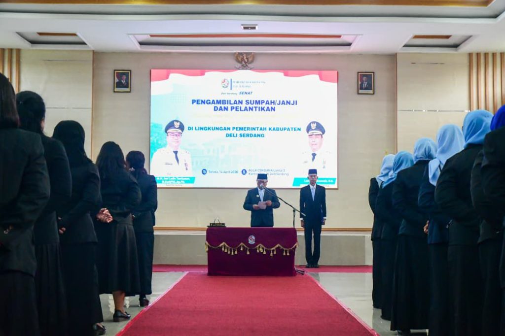 Fokusmedan.com : Wakil Bupati, Lom Lom Suwondo SS, melantik dan mengambil sumpah jabatan 120 aparatur sipil negara (ASN) di lingkungan Pemerintah Kabupaten Deli Serdang, di Aula Cendana Lantai II Kantor Bupati, Lubuk Pakam, Selasa (18/4/2026).